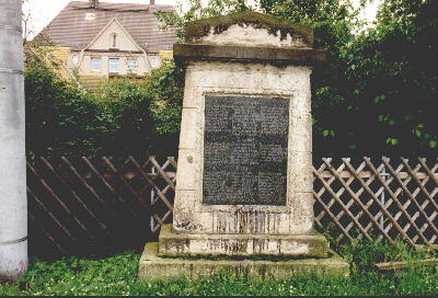 Das noch nicht restaurierte Kriegerdenkmal, im Hintergrund das Pfarrhaus, Lützschena. Foto: Christa Werther