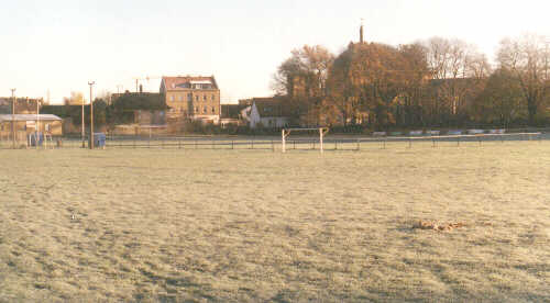 Sportplatz mit Blick auf die Brauereigebäude, Lützschena Foto: Michael Bunk